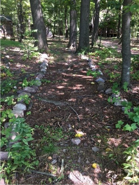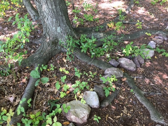 I love paths. We have one that goes to the field for our tractor, but the best ones are those I’ve made to my writing/meditation cabin, and the one I use to walk to the field. These two I’ve lined with rocks and as I stroll by I’m always amazed by the large roots that grow above ground. Different and yet so eye catching. It took a long while to clear the brush away, find and place the stones alongside, and then try to keep them clear enough to follow over the years.